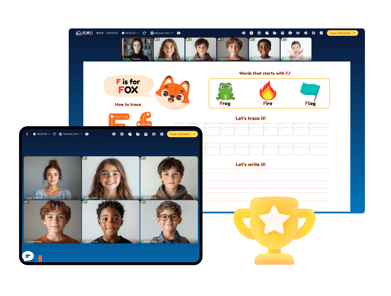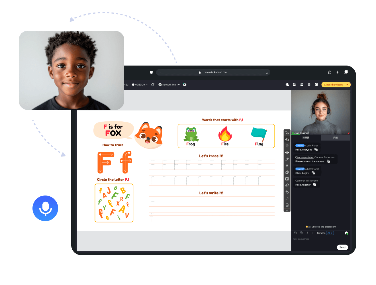 您可以创建1v1或1vN类型的互动⼩班课堂。⽼师可以和所有学⽣同时在线, 进⾏0延时互动。课堂中提供丰富的教学⼯具,帮助⽼师提⾼在线教学的质 量。课堂中⽀持类型丰富的课件,包括word、excel、ppt、H5、MP3、 MP4、png、jpg等